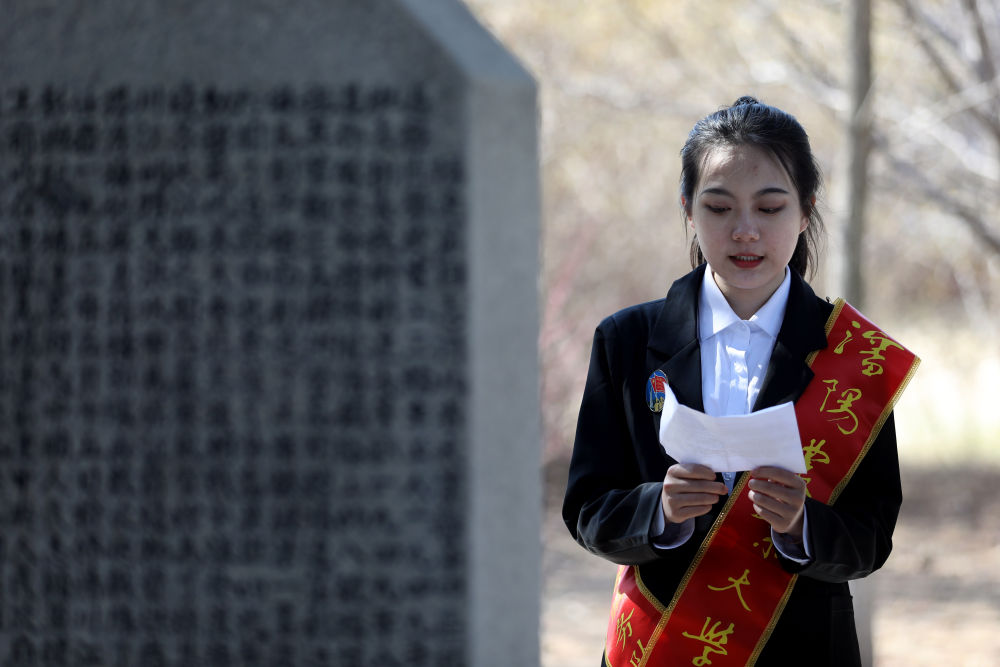 4月4日,沈阳农业大学学生志愿者陈婧代表杨长林在父亲杨连第墓前朗读书信。新华社记者 姚剑锋 摄