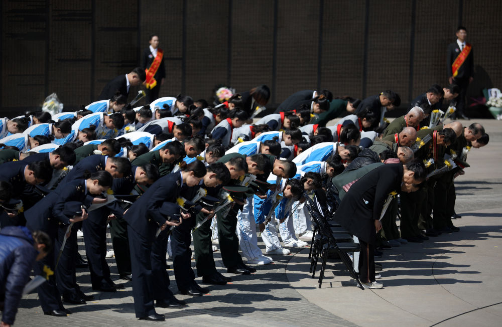 4月4日,志愿军老战士代表和祭扫者代表向沈阳抗美援朝烈士陵园烈士英名墙鞠躬祭拜。新华社记者 姚剑锋 摄