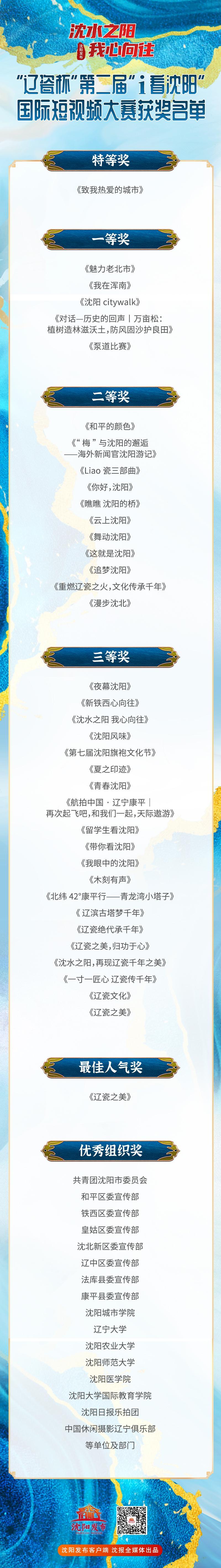 近日,由中共沈阳市委宣传部指导,沈阳市人民政府新闻办公室主办,沈阳日报社、沈阳发布客户端承办,团市委、沈阳市文联、沈阳广播电视台支持的——“辽瓷杯”第二届“i看沈阳”国际短视频大赛落下帷幕。