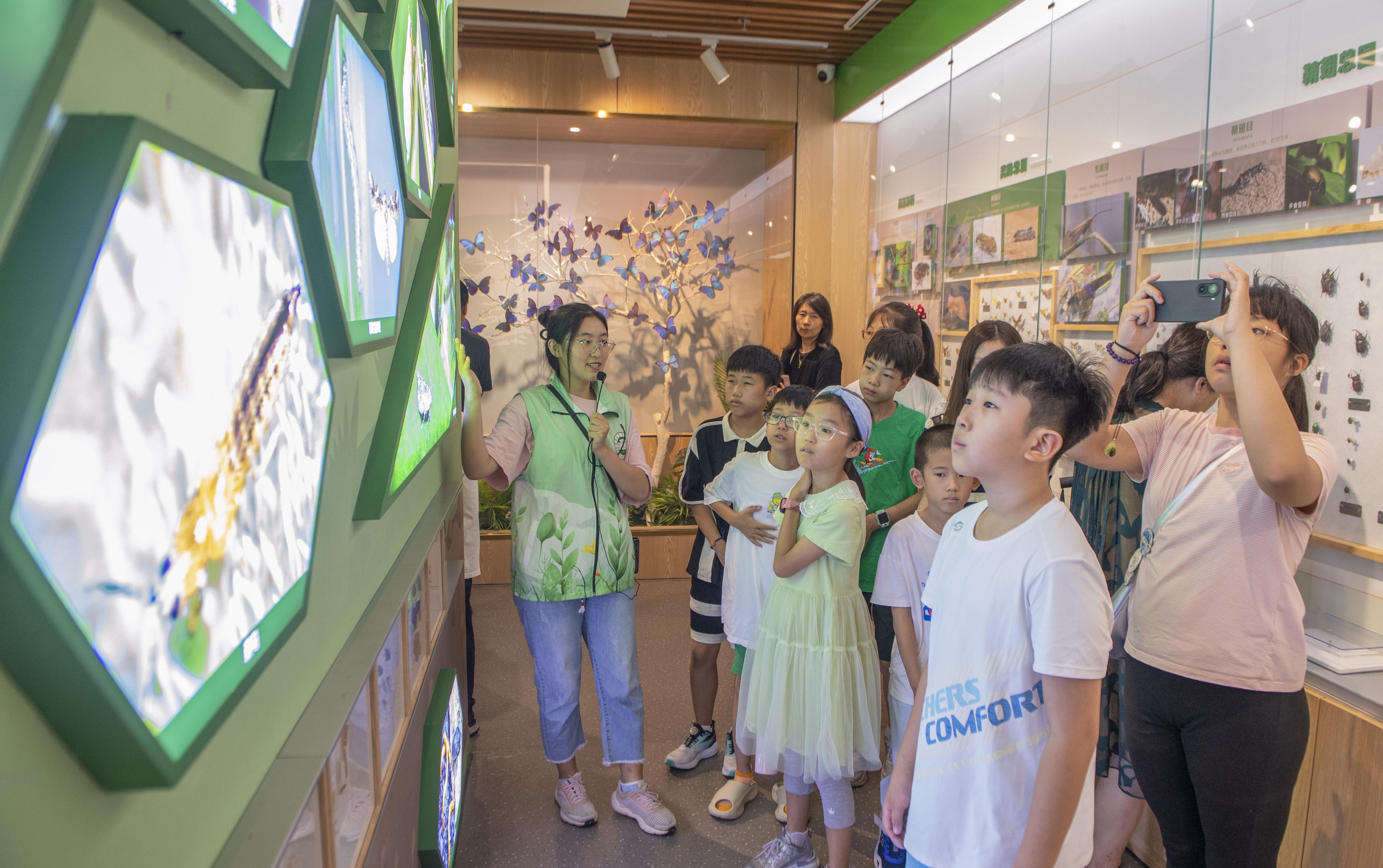 在主展厅“昆虫的世界”,张苏雨先抛出问题:“什么是昆虫?”小朋友们围着展台仔细观察27种小动物,争先恐后地回答。“昆虫有六条腿、身体分三段!”“有的昆虫有翅膀,有的没有!”孩子们的回答五花八门,张苏雨则结合展品,依次讲解昆虫纲繁盛的原因、昆虫的结构与功能、习性与行为以及系统与进化。